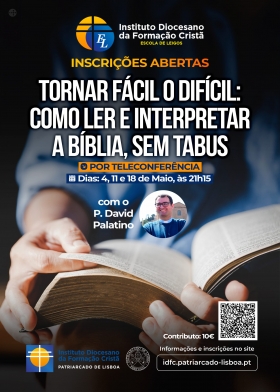 O Instituto Diocesano da Formação Cristã do Patriarcado de Lisboa (IDFC-PL) tem abertas as inscrições para o curso online ‘Tornar fácil o difícil - Como ler e interpretar a Bíblia, sem tabus’, que vai ser orientado pelo Padre David Palatino, em maio.