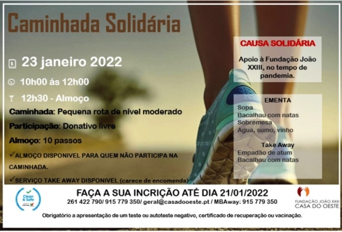 Tendo em vista angariar fundos para as despesas correntes, a Fundação João XXIII, Casa do Oeste, em Ribamar, Lourinhã, promove neste Domingo, dia 23 de janeiro, uma ‘Caminhada Solidária’, entre as 10h00 e as 12h00. A caminhada inclui uma “pequena rota de nível moderado”, segundo a organização, e a participação está sujeita a um donativo livre.