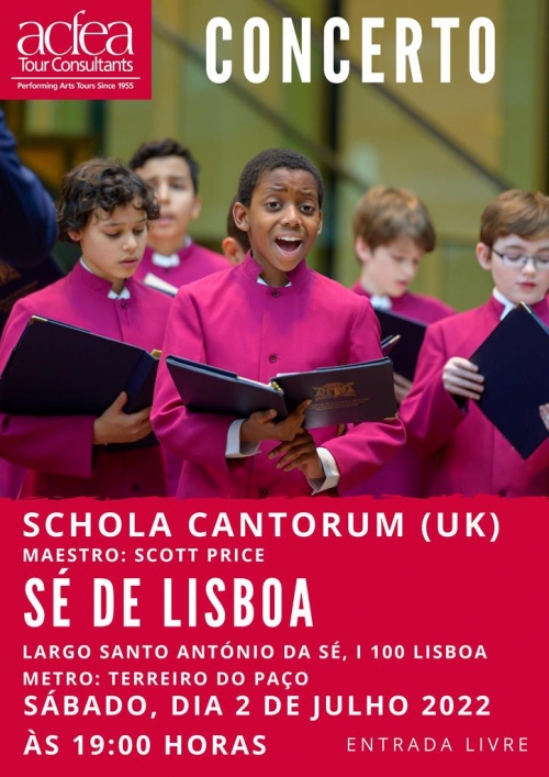 A ‘Schola Cantorum’ do Cardinal Vaughan Memorial School, oriunda de Londres, vai realizar três concertos em Lisboa, numa digressão que inicia na igreja paroquial de Nossa Senhora do Cabo, em Linda-a-Velha, a 1 de julho, sexta-feira, às 21h30. “O coro, sob a direção do Maestro Scott Price, vai interpretar obras desde século XVI até aos nossos dias”, revela um comunicado. A 2 de julho, a ‘Schola Cantorum’ atua na Sé de Lisboa, às 19h00, e no dia seguinte na Igreja de São Jorge (Cemitério Inglês), junto ao Jardim da Estrela, às 19h30. Os concertos são de entrada livre.