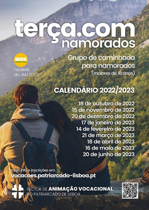 O Setor de Animação Vocacional (SAV) do Patriarcado de Lisboa está a convidar os namorados maiores de 18 anos para um ‘Grupo de caminhada para namorados’. O ‘terça.com namorados’ vai ter lugar na sede da JMJ 2023, no Beato, em Lisboa, a um ritmo mensal, nos dias 15 de novembro, 20 de dezembro, 17 de janeiro de 2023, 14 de fevereiro, 21 de março, 18 de abril, 16 de maio e 20 de junho.