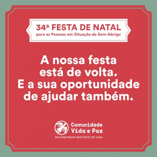 Estão abertas as inscrições a voluntários para a 34.ª Festa de Natal para as Pessoas em Situação de Sem-abrigo, a realizar nos dias 16, 17 e 18 de dezembro, na Cantina da Cidade Universitária, em Lisboa, e que é organizada pela Comunidade Vida e Paz.