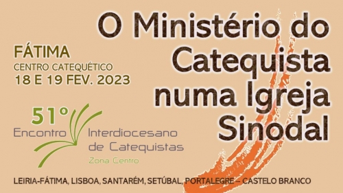 Decorrerá, em Fátima, nos dias 18 e 19 de fevereiro o 51º Encontro interdiocesano de catequistas com o tema “O Ministério do Catequista numa Igreja Sinodal”. Este encontro é aberto a todos os catequistas das dioceses de Leiria-Fátima, Lisboa, Portalegre-Castelo Branco, Santarém e Setúbal. A inscrição é feita no nosso site.