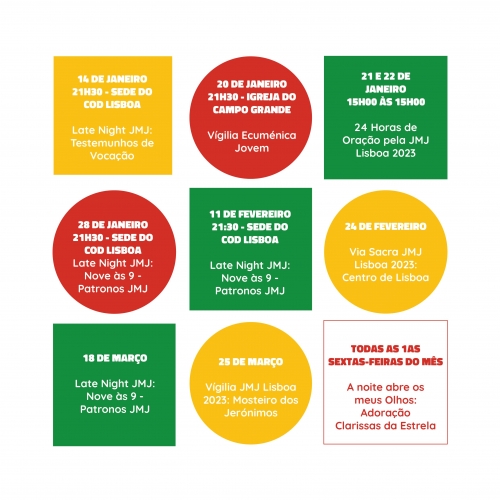 Esta é uma proposta global de oração pela JMJ Lisboa 2023. Em Lisboa cada vigararia organizará vigílias com adoração do santíssimo, interrompidas apenas para a celebração da missa nas 24H entre as 15h de Sábado e as 15H de Domingo. O guião de oração tem como mote os patronos da JMJ Lisboa 2023, e pode ser obtido junto dos COP de cada paróquia. Procura a vigília de adoração organizada pela tua paróquia e participa!