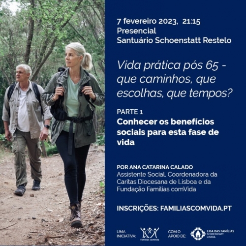 Organizada pela Fundação Famílias comVida, esta iniciativa tem como tema ‘Vida prática pós 65 - que caminhos, que escolhas, que tempos?’ e vai decorrer no dia 7 de fevereiro, terça-feira, às 21h30, de modo presencial, no Santuário de Nossa Senhora de Schoenstatt, no Restelo.