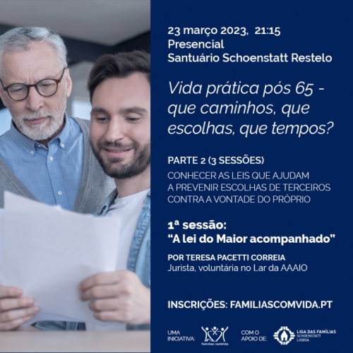 ‘Lei do maior acompanhado’ é o tema da próxima ação de informação do programa ‘Vida prática pós 65’, organizada pela Fundação Famílias comVida, que vai decorrer no dia 23 de março, quinta-feira, a partir das 21h30, de modo presencial, no Santuário de Nossa Senhora de Schoenstatt, no Restelo. “Conhecer as Leis que ajudam a prevenir escolhas de terceiros contra sua vontade - Lei do maior acompanhado”, é o objetivo do encontro, que vai ser orientado por Teresa Pacetti Correia, jurista e voluntária no Lar AAAIO (Associação das Antigas Alunas do Instituto de Odivelas), que tem entrada livre.