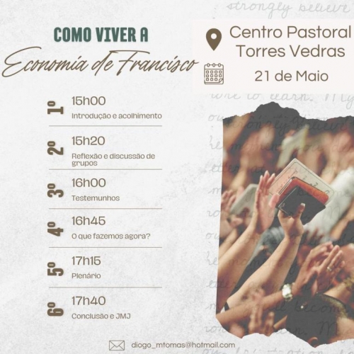 A Equipa Diocesana da ACR Lisboa/Fundação João XXIII - Casa do Oeste está a organizar um encontro para refletir e agir rumo à ‘Economia de Francisco’, que vai ter lugar no próximo dia 21 de maio, no Centro Pastoral de Torres Vedras, a partir das 15h00 e terminando pelas 18h00. Haverá reflexão e discussão de grupos, testemunhos e o tema ‘O que fazemos agora?’.