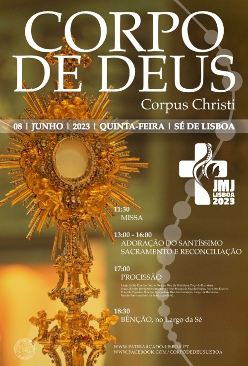 “A JMJ Lisboa 2023 é para ser preparada e vivenciada com fé”, refere uma carta enviada aos párocos. As celebrações vão ser presididas pelo Cardeal-Patriarca, D. Manuel Clemente: Missa na Sé, às 11h30, depois um tempo de Adoração do Santíssimo Sacramento e Sacramento da Reconciliação, das 13h00 às 16h00, e a seguir a Procissão, que sai da Sé, às 17h00, e termina também no adro da Sé com a Bênção do Santíssimo Sacramento, cerca das 18h30. “A Procissão será um dos momentos altos de encontro com Deus, pela habitual numerosa participação de fiéis e o elevado ambiente orante”, destaca a nota.