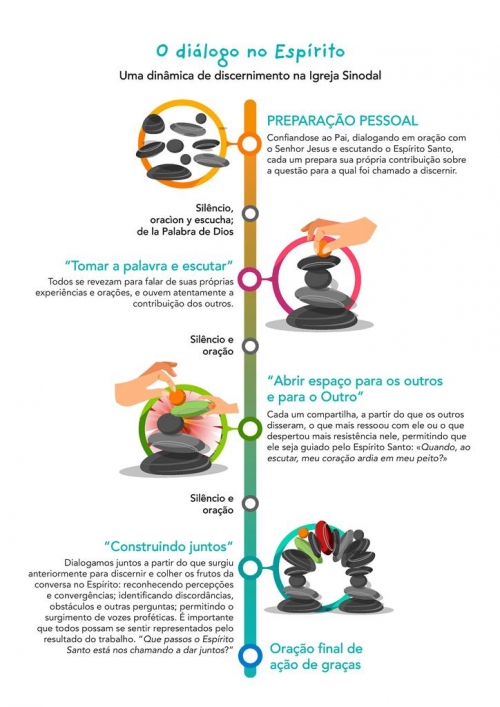 O terceiro elemento metodológico que parece importante sublinhar é a respeito do modo de proceder em caminhada sinodal. O IL deixa claro que há características próprias de uma Igreja sinodal e que, por isso, «uma Igreja sinodal também é marcada por uma maneira particular de proceder». Continua o IL: «De acordo com o resultado da primeira fase, o diálogo no Espírito é essa maneira de proceder» (n.º 14). Já desde os primeiros passos desta caminhada sinodal o Diálogo espiritual, ou Diálogo no Espírito, surgia como a coordenada fundamental para os trabalhos da caminhada sinodal. Assim, os vários participantes nos vários níveis do caminho, são chamados não a apresentar as suas opiniões pessoais ou então a desenvolver um sistema teológico ou filosófico a respeito dos temas, mas a escutar o que o Espírito Santo diz através do caminho conjunto. Este método parece o mais fecundo, porque não esgota um encontro de pessoas na defesa de pontos pessoais, mas abre à disponibilidade para escutar o outro e, através do outro, deixar o Espírito falar no íntimo da alma. Não se trata, portanto, de uma defesa de posições em que ganha a maioria ou o que fala mais alto, mas é dar espaço para que seja o Espírito Santo a falar. De uma forma muito didática e pedagógica, o IL apresenta um esquema sobre o diálogo no Espírito, para que ele continue a ser vivenciado por todos os participantes.