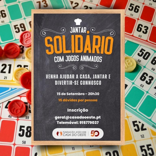 A Fundação João XXIII – Casa do Oeste está a organizar um jantar solidário, com jogos animados, para ajudar a instituição sediada em Ribamar. A iniciativa vai ter lugar no próximo dia 15 de setembro, sexta-feira, pelas 20h30. “Venha ajudar a casa, jantar e divertir-se connosco. Iremos também promover um loto com brindes apetitosos e/ou artesanais!”, refere uma nota. A participação no repasto tem um custo de 15 euros por pessoa. “A Casa do Oeste precisa da sua ajuda! Esperamos e precisamos de si. Faça a sua inscrição o mais breve possível”, convida a instituição.