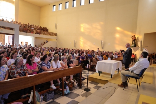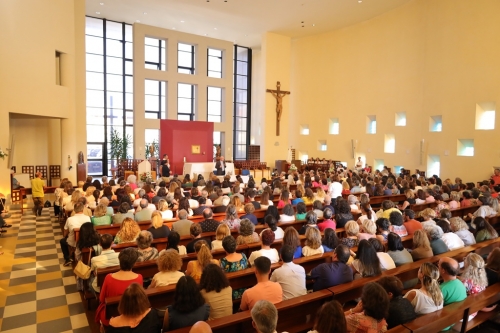 Após a manhã formativa no Seminário e Externato de Penafirme, cerca de 600 catequistas reuniram-se na Igreja de Santa Cruz e escutaram palavras de incentivo por parte D. Rui Valério. “Não desistam! Não façam cara de derrotados. Isto é como as sementes que se vão desenvolvendo e crescendo. Pensai nas vossas parábolas de vida com os vossos maridos e as vossas esposas. É a nossa história, é a nossa parábola de amor com Jesus que me dá luz e abertura para eu compreender e interpretar aquilo que acontece na minha igreja, em cada espaço e em cada momento”, destacou, voltando a sublinhar a palavra amor: “O mistério do nosso seguir Cristo, o mistério de nós aderirmos a Ele, é do coração. E isto é para qualquer pessoa, independentemente da sua idade. Porque o que nos toca o coração, nós nunca mais desistimos disso. Há uma coisa que permanece: o amor. Portanto, o nosso grande desafio é transformar a nossa evangelização, a nossa pastoral, a nossa catequese, a nossa pedagogia da pregação, transformarmos isso em momentos de paixão, de enamoramento de Jesus. Para todas as idades”.