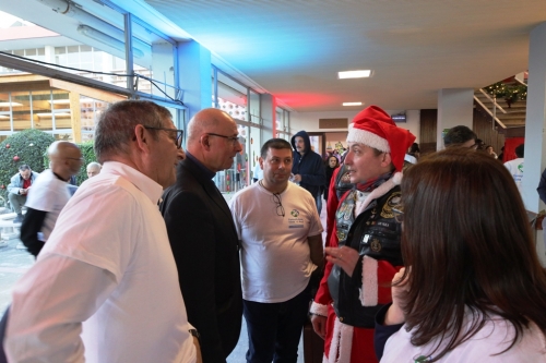 A visita começou pela área do Barbeiro e Duches, onde os voluntários trabalham a autoestima das pessoas em situação de sem-abrigo através da mudança de visual. Foi neste local que o Patriarca de Lisboa escutou as primeiras (duras) histórias de vida dos convidados da 35.ª Festa de Natal da Comunidade Vida e Paz. Seguiu-se a zona da Cozinha, com D. Rui Valério a ficar à porta, por questões de higiene, por não estar ‘equipado’ para o efeito, mas a saudar os cozinheiros e a abençoar todas aquelas mãos que prepararam milhares de refeições ao longo dos três dias de festa. Subindo ao primeiro piso, o Patriarca foi contactando com diversos convidados, procurando conhecer as suas vidas e deixando sempre uma palavra de coragem e esperança. Foi assim no espaço Cidadania, onde as pessoas em situação de sem-abrigo são desafiadas pela instituição tutelada pelo Patriarcado de Lisboa a mudar de vida. Antes de se ir paramentar para a celebração, D. Rui Valério esteve ainda à conversa com dois ‘Pais Natais’ motards, que também abrilhantavam a festa.