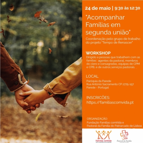 Uma semana depois, a 24 de maio, das 9h30 às 12h30, na Paróquia da Parede, o cónego Rui Pedro de Carvalho e o casal Maria João e Luís Faria explicam como ‘Acompanhar famílias em segunda união ou separadas’ no 2.º workshop. “Este workshop tem como principal objetivo apresentar e sensibilizar para o projeto pastoral ‘Tempo de Renascer’, nascido na sequência Congresso da Pastoral da Família da Diocese de Lisboa, em outubro de 2021, e que visa apoiar pessoas separadas e casais em segunda união através de um itinerário de discernimento cristão e de integração na vida da Igreja, que inclui acompanhamento personalizado e em grupo, com o objetivo de promover ‘a caridade na verdade’ e de apoiar o discernimento pastoral nas comunidades paroquiais”, salientam os promotores.