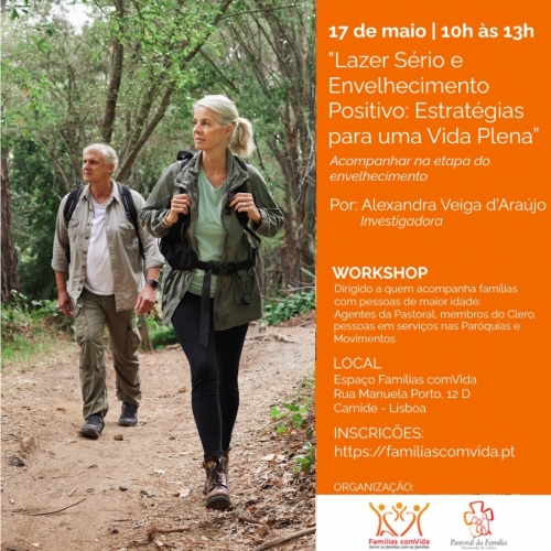 O 1.º workshop, que tem como tema ‘Lazer sério e envelhecimento positivo: estratégias para uma vida plena’, vai decorrer no dia 17 de maio, entre as 10h00 e as 13h00, no espaço Família comVida, em Carnide, e tem coordenação de Maria Alexandra Veiga d’Araújo, investigadora na área da longevidade. “Este workshop é apresentado como uma “viagem prática rumo à descoberta do Lazer Sério como elemento transformador no processo de envelhecimento”. Serão exploradas estratégias baseadas em evidência científica que mostram como o lazer sério contribui para o desenvolvimento pessoal, saúde cognitiva e social, resiliência emocional e criatividade — promovendo um envelhecimento ativo e com qualidade”, refere a organização.