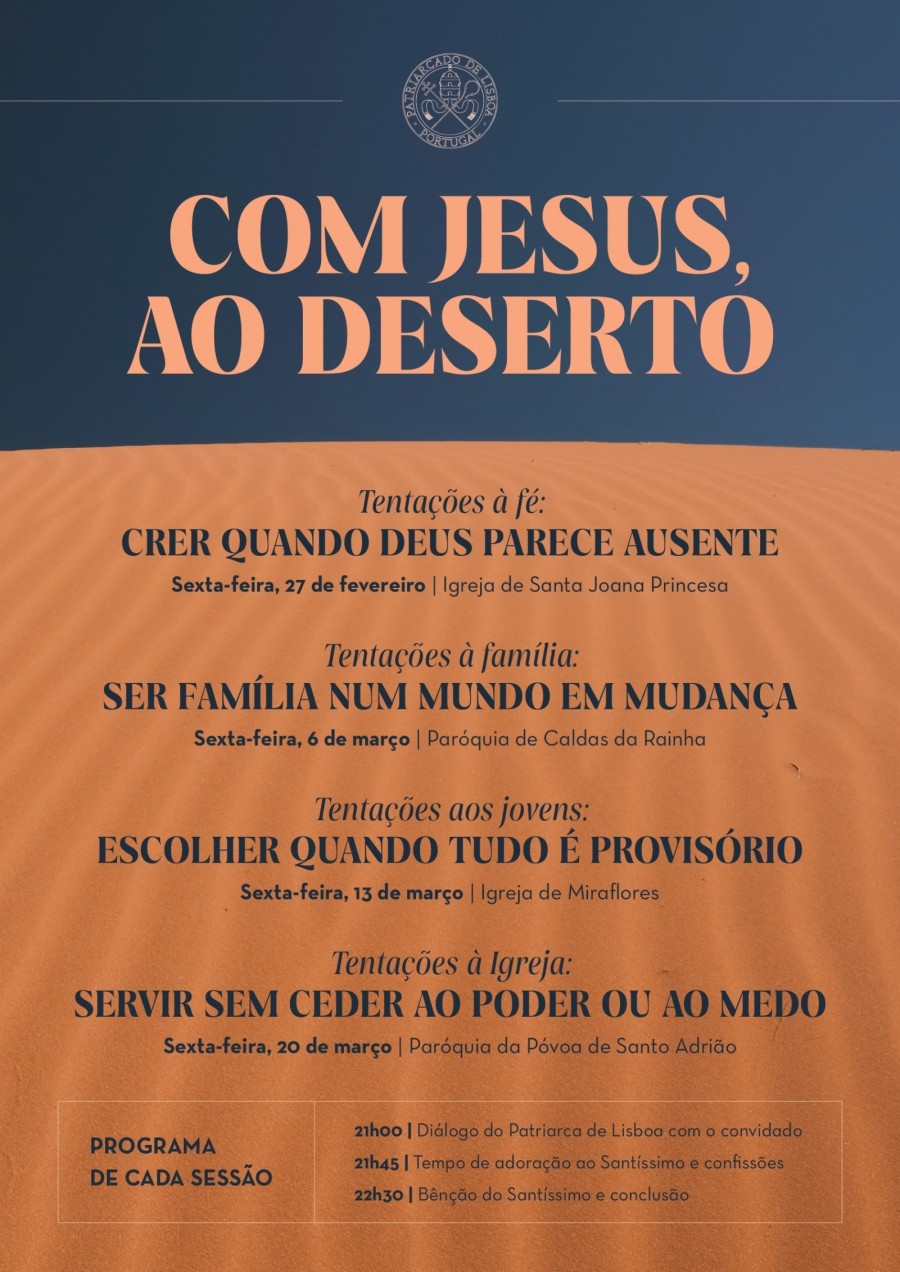 O Patriarcado de Lisboa promove, ao longo do tempo da Quaresma, um conjunto de encontros sob o lema ‘Com Jesus, ao deserto - Discernir as tentações do nosso tempo à luz do Evangelho’, propondo momentos de reflexão, oração e diálogo em torno das “tentações” que marcam a vida cristã na atualidade.