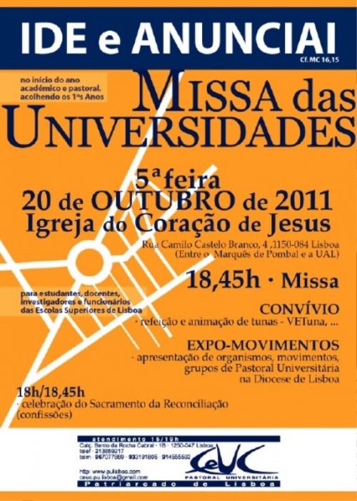 Na igreja do Sagrado Coração de Jesus, em Lisboa, no passado dia 20 de Outubro, esta celebração organizada o CeUC – Pastoral Universitária de Lisboa marcou o início do ano académico para os universitários católicos da diocese. Na sua homilia, D. Joaquim começou por lembrar que “evangelizar é, antes de mais, partilhar a própria experiência cristã, o encontro com Cristo, que fez mudar a própria vida”. Depois, apontou o “dinamismo que urge recuperar”: “Ser discípulos para se tornarem testemunhas, e poder, de verdade, ensinar”.