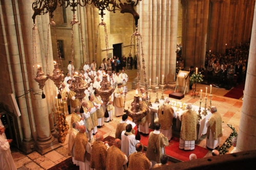 É na Eucaristia, principal sacramento da nossa fé que este realismo da Cruz nos leva a encontrar o ressuscitado. “Tomai e comei, isto é o Meu Corpo entregue por vós”. “Tomai e bebei, este é o cálice do Meu sangue… derramado por vós”. Na Eucaristia, no mesmo acto em que, como povo sacerdotal, nos unimos a Cristo glorioso para oferecer a Deus Pai o sacrifício redentor, confrontamo-nos sempre com o realismo da Cruz. A Eucaristia celebra a actualidade do sacrifício redentor de Cristo e esse acontece na Cruz e encontra a sua plenitude na ressurreição. O Cristo que vem ao nosso encontro, na fé, que quer caminhar connosco até ao triunfo da vida, continua a ser o crucificado ressuscitado. É por isso que, na Liturgia, é obrigatório quer a Cruz presida ao altar da Eucaristia.