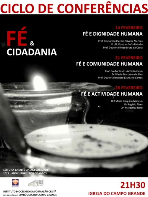 A partir das 21h30, a reflexão tem como tema principal ‘Fé & Cidadania’, confluindo assim o Ano da Fé (que a Igreja vive até Novembro de 2013) e o Ano Europeu dos Cidadãos. No dia 14 de fevereiro, o tema ‘Fé e dignidade humana’ terá como oradores Guilherme d’Oliveira Martins, Sofia Reimão e Alfredo Bruto da Costa. ‘Fé e comunidade humana’, no dia 21, e ‘Fé e atividade humana’, a 28 de fevereiro, são os outros dois temas desta Leitura Crente da Atualidade. Formação a Distância Ainda no âmbito do IDFC, o Centro de Formação a Distância do Patriarcado de Lisboa (form.distancia@patriarcado-lisboa.pt), que visa “proporcionar uma formação integral a todos os membros do Povo de Deus, a fim de estes poderem desempenhar responsabilidades na Igreja e na sociedade”, promove um curso com um Tronco Comum sobre ‘Mensagem Cristã I – Iniciação à Bíblia’, ‘Mensagem Cristã II – Jesus, o Cristo’, ‘Mensagem Cristã III – Igreja e Sacramentos’ e ‘A Vida em Cristo – A moral cristã’. Associado do Instituto Internacional de Teología a Distancia, de Madrid, este centro organiza também diversos cursos de Antropologia, Catequética, Liturgia, Doutrina Social da Igreja e Voluntariado. Escola Diocesana de Música Sacra A Escola Diocesana de Música Sacra, que pertence também ao IDFC e que “promove a aprendizagem e o cultivo da música sacra, segundo as orientações da Igreja”, inaugurou um novo site, acessível em www.edmslisboa.webnode.pt. Informações: 213558026, 916209919, idfc@patriarcado-lisboa.pt ou www.idfc.com.pt![]() |