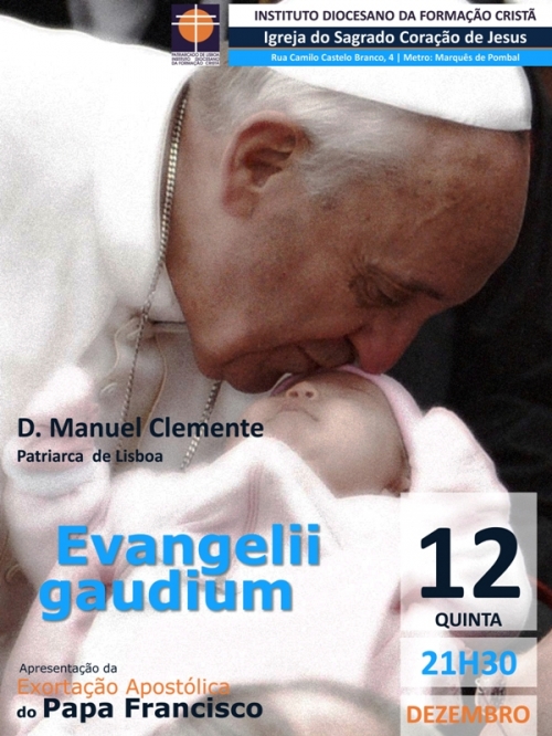 D. Manuel Clemente vai apresentar a Exortação Apostólica ‘Evangelii Gaudium’ (‘A Alegria do Evangelho’), do Papa Francisco, na próxima quinta-feira, dia 12 de dezembro. A apresentação decorre a partir das 21h30, na sede do Instituto Diocesano da Formação Cristã (igreja do Sagrado Coração de Jesus), em Lisboa.