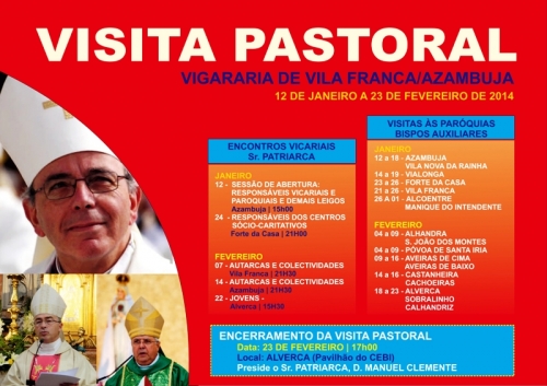 Entre 12 de janeiro e 23 de fevereiro, o Patriarca de Lisboa, D. Manuel Clemente, e os seus dois Bispos Auxiliares, D. Joaquim Mendes e D. Nuno Brás, vão conhecer a realidade das 17 paróquias que compõem esta vigararia: Azambuja e Vila Nova da Rainha (12 a 18 de janeiro), Vialonga (14 a 19 de janeiro), Forte da Casa (23 a 26 de janeiro), Vila Franca de Xira (21 a 26 de janeiro), Alcoentre e Manique do Intendente (26 de janeiro a 1 de fevereiro), Alhandra e São João dos Montes (4 a 9 de fevereiro), Póvoa de Santa Iria (igualmente 4 a 9 de fevereiro), Aveiras de Cima e Aveiras de Baixo (9 a 16 de fevereiro), Castanheira do Ribatejo e Cachoeiras (14 a 16 de fevereiro), Alverca do Ribatejo, Sobralinho e Calhandriz (18 a 23 de fevereiro). “Esta é uma vigararia com características dificultosas, devido à extensão territorial. Está inserida em dois concelhos – concelho de Vila Franca e concelho de Azambuja –, mas é uma vigararia que tem uma comunhão de amizade, de partilha e de espírito de ajuda muito interessante”, ressalva o vigário.