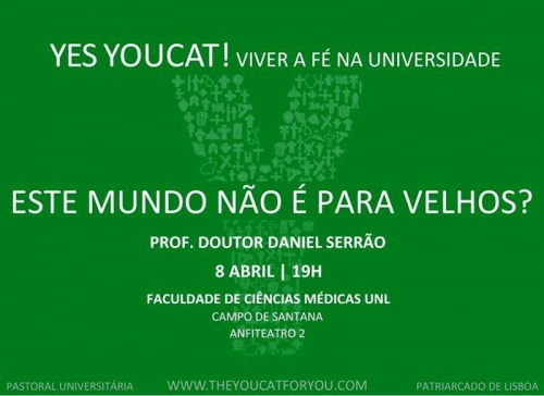 O projecto ‘Yes Youcat! Viver a fé’ anda pelas universidades de Lisboa e conta ao todo com seis sessões que abordam temas do Youcat, o catecismo jovem da Igreja Católica. O próximo encontro, que tem como ponto de partida a pergunta ‘Este mundo não é para velhos?’, conta com intervenção de Daniel Serrão e realiza-se no dia 8 de abril, às 19h, na Faculdade de Ciências Médicas da Universidade Nova de Lisboa.