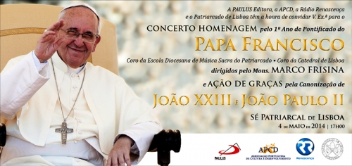 O compositor italiano Marco Frisina continua a ser o convidado especial no concerto que a Paulus Editora está a promover, em conjunto com a Associação Portuguesa de Cultura e Desenvolvimento (APCD), a Rádio Renascença e o Patriarcado de Lisboa, e que terá interpretação pelos Coros da Catedral de Lisboa e da Escola Diocesana de Música Sacra do Patriarcado. Este será também um momento de ação de graças pelas canonizações de João Paulo II e João XXIII. Por acontecer depois das canonizações dos Papas, durante o concerto vão ser tocados na Sé os hinos dedicados a cada um dos novos santos. Outras das novidades são o concerto multimédia com cânticos de monsenhor Marco Frisina, inspirados nas orações de São Francisco, e os vídeos a recordar a eleição, os gestos mais significativos e as viagens do Papa Francisco. Haverá ainda um momento de oração de consagração a Nossa Senhora, já previsto no alinhamento anterior, mas agora celebrado no Dia da Mãe.
