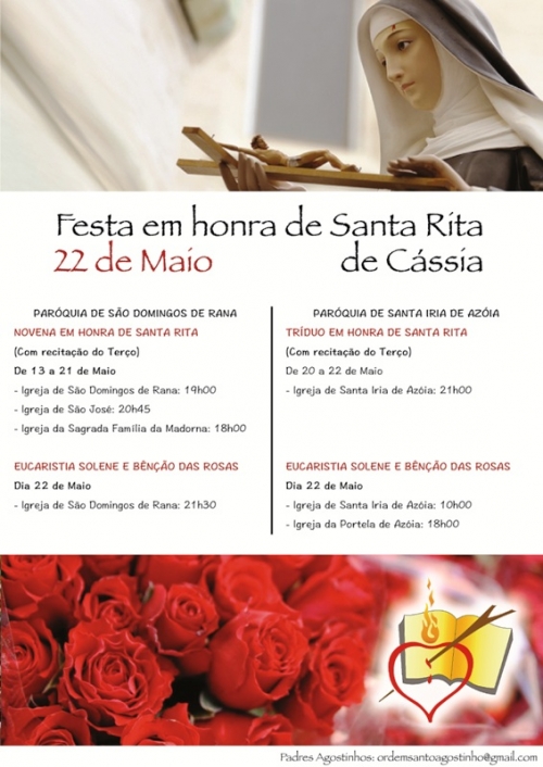 No 22 de maio, quinta-feira, a Eucaristia Solene com a Bênção das Rosas vai ser celebrada nas duas paróquias: na igreja de Santa Iria de Azóia, às 10h00; na igreja da Portela de Azóia, às 18h00; e na igreja de São Domingos de Rana, às 21h30. A anteceder a festa, decorre em São Domingos, de 13 a 21 de maio, uma novena, e em Santa Iria, de 20 a 22, um tríduo, sendo que ambos os momentos compreendem a recitação do Terço. “Estas celebrações ajudar-nos-ão a pedir a intercessão de Santa Rita para que, seguindo o seu exemplo, sejamos homens e mulheres de Fé que saibam viver a sua vida cada vez mais unidos a Cristo”, observa um comunicado, sublinhando a figura de Santa Rita de Cássia (1381-1457), Monja Agostinha: “Santa Rita não nos deixou nenhuma doutrina escrita. Deixou-nos o seu exempto de vida: mulher de uma grande vontade, lutou contra as convenções sociais da altura procurando sempre seguir o chamamento do Senhor Jesus”.