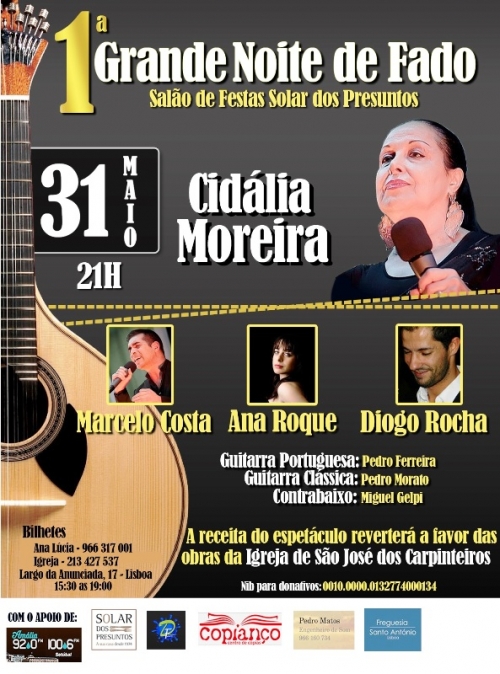 Uma Noite de Fados com a fadista Cidália Moreira, no terraço do Restaurante Solar dos Presuntos, em Lisboa, é a mais recente iniciativa de angariação de fundos para a igreja de São José dos Carpinteiros. O espetáculo decorre no dia 31 de maio, às 21h, com o preço dos bilhetes a ser de 20 euros.