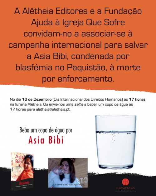 Beber um copo de água devia ser um gesto livre e natural para toda a gente. Ninguém deve ser condenado á morte por causa disto. Dia 10 de Dezembro (Dia Internacional dos Direitos Humanos), pelas 17h00, venha beber um copo de água por Asia Bibi à Alêtheia (Rua do Século, 13 Lisboa) ou tire uma selfie a beber um copo de água e envie-nos por mail para salvemasiabibi@gmail.com ou coloque directamente no facebook.com/SalvemAsiaBibi. Ao final da tarde, pelas 18h30, estaremos no Chiado no Presépio na Cidade a rezar por esta mesma intenção. Junte-se a nós!