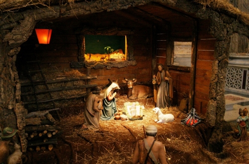 Uns meses depois, quando Maria estava quase a dar à luz, teve de se deslocar com José a Belém, onde deveriam recensear-se. Já em Belém, chega o momento de Maria dar à luz o menino. Estando longe de casa e da família, procuram lugar na hospedaria, onde não há lugar para os acolher e José e Maria não encontram outra solução, a não ser instalarem-se num curral de animais. Jesus não nasceu num palácio, como os reis do mundo, mas num curral. Não teve berço de oiro ou de madeiras nobres, mas foi recostado numa manjedoura, o lugar onde comem os animais. Jesus, aquele que viria a dar o seu corpo e o seu sangue como alimento, começa a sua vida, precisamente, deitado no lugar onde se põe a comida. Isto é uma antecipação da Eucaristia, presente de Deus, onde Deus se faz presente. Jesus também não teve como testemunhas do seu nascimento, as pessoas ilustres, nem os poetas dotados que contassem tão sublime acontecimento, mas simplesmente um par de animais, um burro e uma vaca que ali se abrigavam. Apesar de estarem presentes, dificilmente estes animais entenderam perfeitamente o que ali se passou. Eles simbolizam a humanidade descrente, com dificuldade em compreender a Deus, a quem o Menino é apresentado, como um novo clarão a iluminar os olhos. Mais tarde, veremos Santo António falar aos peixes, num tempo em que a humanidade também não o queria escutar.