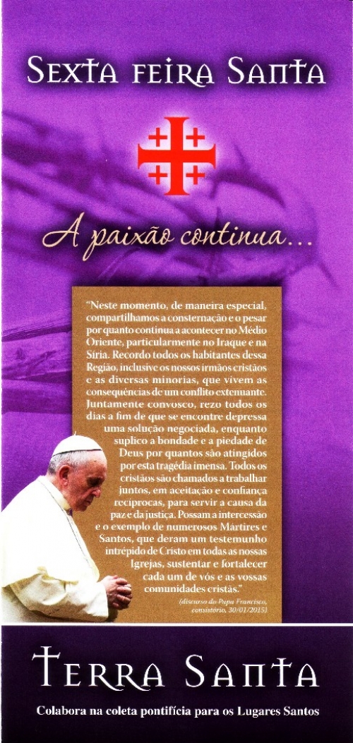 A Santa Sé convocou os cristãos a participarem na Coleta para a Terra Santa, tradicional recolha de donativos de Sexta-Feira Santa, dia em que a Igreja celebra a Paixão de Cristo. Numa carta divulgada recentemente, pela Congregação para as Igrejas Orientais, o prefeito desta congregação, cardeal Leonardo Sandri, recorda que a Igreja Católica exprime por meio da oração e do ofertório o alento às comunidades dos fiéis e aos Lugares Santos. O cardeal argentino pede a solidariedade dos cristãos do mundo inteiro para com os cristãos da Terra Santa e sublinha que esta coleta “é mais do que nunca uma ocasião preciosa” para os cristãos serem “peregrinos na fé seguindo o exemplo do Santo Padre que visitou a região em março de 2014”.