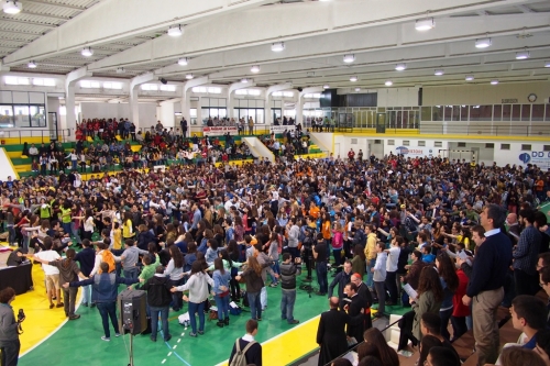Já passam das 10h00 e o Convento de Mafra tem uma companhia especial. São imensos os jovens que cantam, dançam e desdobram-se em acrobacias. Chegam de todas as vigararias da Diocese de Lisboa para, juntos, refletirem sobre o tema escolhido pelo Papa Francisco para a XXX Jornada Mundial da Juventude (2015): ‘Felizes os puros de coração, porque verão a Deus’ (Mt 5, 8). Uns atrás dos outros, e todos atrás da música, seguem pelas ruas, em direção ao pavilhão gimnodesportivo que rapidamente fica preenchido.