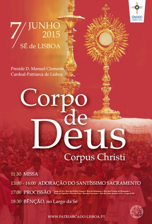 No dia 7 de junho, Domingo, a Sé Patriarcal de Lisboa acolhe, às 11h30, a celebração da Eucaristia na Solenidade do Santíssimo Corpo e Sangue de Cristo, popularmente conhecida como Corpo de Deus, presidida pelo Cardeal-Patriarca de Lisboa, D. Manuel Clemente. Após a celebração, haverá, entre as 13h00 e as 16h00, Adoração do Santíssimo Sacramento.