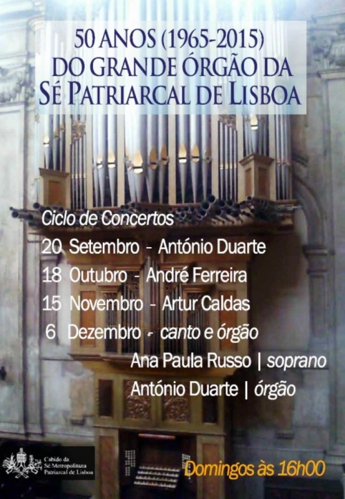 Tem início este Domingo, 20 de setembro, o ciclo de concertos comemorativo dos 50 anos (1965-2015) do grande órgão da Sé Patriarcal de Lisboa. A partir das 16 horas, decorre o primeiro concerto pelo organista António Duarte. A iniciativa prossegue a 18 de outubro, com o organista André Ferreira, e a 15 de novembro, com o organista Artur Caldas, terminando no dia 6 de dezembro com um concerto de canto e órgão, com a soprano Ana Paula Russo e o organista António Duarte.