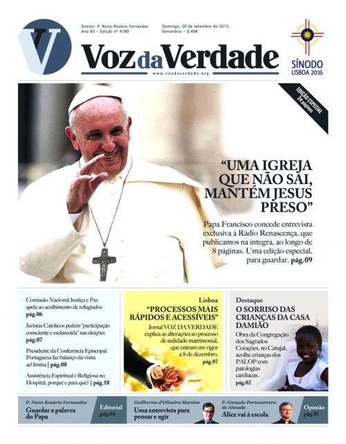 Esta semana, porém, em Portugal, fomos surpreendidos com a entrevista concedida à Rádio Renascença, a emissora católica portuguesa. Por intervenção meritória da jornalista vaticanista Aura Miguel, que também colabora com o Jornal VOZ DA VERDADE, esta entrevista aconteceu durante a visita ad limina dos nossos Bispos, na passada semana, foi transmitida na segunda-feira, 14 de setembro, e agora, com as devidas autorizações, é publicada neste nosso jornal, na íntegra, em edição especial alargada. Pretendemos, assim, que a palavra do Santo Padre possa permanecer guardada para além de no coração de cada um, também em suporte físico, para memória futura.