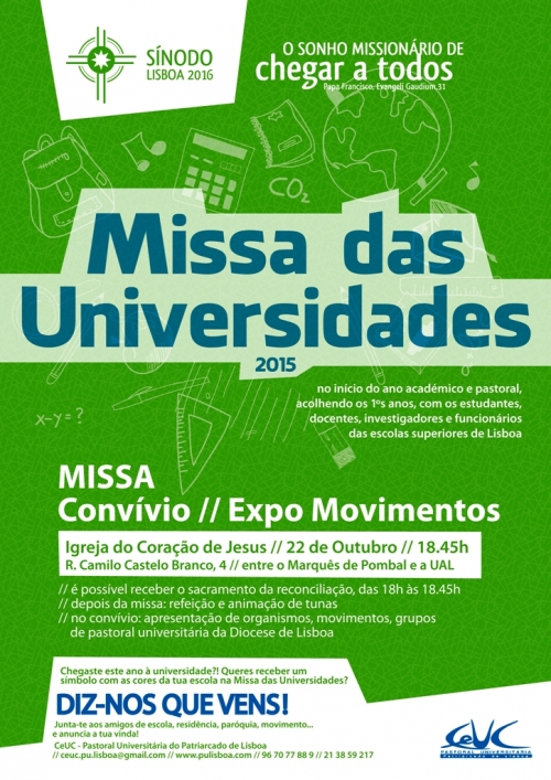 A tradicional Missa das Universidades, celebrada no início do ano académico e pastoral, decorre no próximo dia 22 de outubro, às 18h45, na igreja do Coração de Jesus, em Lisboa, havendo confissões a partir das 18h00. Organizada pelo CeUC - Pastoral Universitária da diocese, a celebração pretende ser um momento de acolhimento aos alunos dos primeiros anos. Após a Eucaristia, haverá refeição, animação de tunas e outros momentos de convívio, com apresentação de organismos, movimentos e grupos de pastoral universitária.