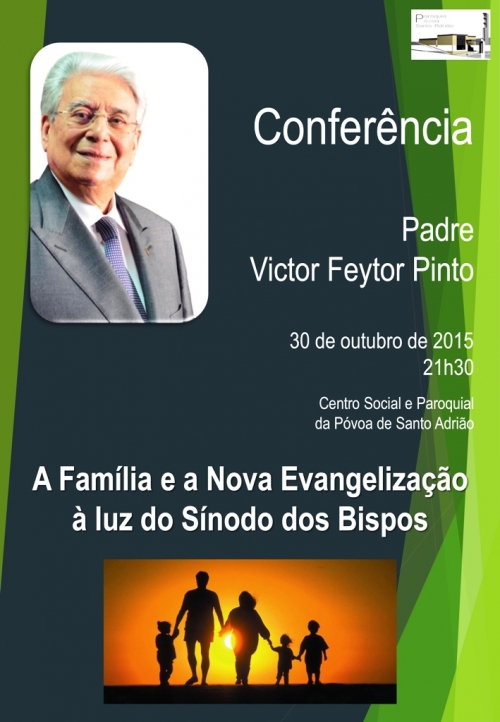 ‘A Família e a nova envangelização, à luz do Sínodo dos Bispos’ é o tema da conferência que o padre Victor Feytor Pinto vai proferir, dia 30 de outubro, pelas 21h30, no salão do Centro Paroquial da Póvoa de Santo Adrião. Esta iniciativa insere-se na caminhada sinodal que a paróquia está a realizar. “A cada pessoa que participe, nesta conferência, pede-se que convide um amigo, um conhecido, um familiar que esteja mais afastado e nas periferias, da comunidade paroquial, dando assim continuidade aos centros de diálogo e escuta”, salienta um comunicado da organização.