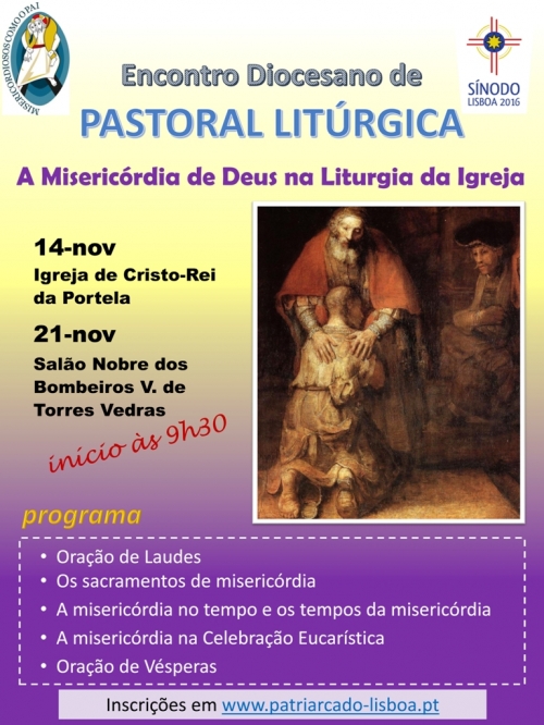 O Departamento de Liturgia do Patriarcado de Lisboa organiza o Encontro Diocesano de Pastoral Litúrgica, nos próximos dias 14 e 21 de novembro, na Portela e em Torres Vedras, respetivamente. ‘A Misericórdia de Deus na Liturgia da Igreja’ é o tema do encontro que vai decorrer, a partir das 9h30, na igreja de Cristo Rei da Portela e no salão nobre dos Bombeiros Voluntários de Torres Vedras, e que vai refletir as temáticas ‘Os sacramentos de misericórdia’, ‘A misericórdia no tempo e os tempos da misericórdia’ e ‘A misericórdia na Celebração Eucarística’.