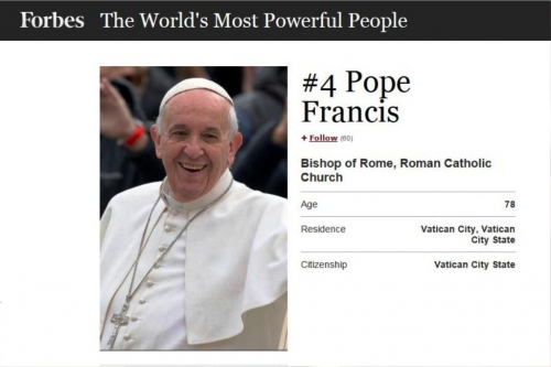 A revista Forbes publica todos os anos a lista das pessoas mais poderosas do planeta. De entre os homens, depois de V. Putin (1º lugar) e de B. Obama (2º lugar), surge o Papa Francisco (3º lugar).
