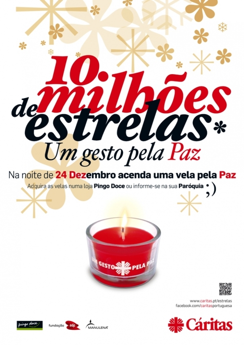 A Cáritas Portuguesa promove, até janeiro, a sua campanha de Natal ‘10 Milhões de Estrelas – Um gesto pela Paz’, procurando “um compromisso com a paz no mundo” e na luta contra a pobreza. “Todos os que, para além de assumirem este compromisso, quiserem juntar-se à Cáritas, participando na sua missão de estar ao lado dos mais frágeis, poderão adquirir uma vela, pelo valor simbólico de 1 euro, que nos ajudará a apoiar pessoas e famílias em situação de pobreza”, refere uma nota da organização católica. Do valor angariado, 65% destina-se a todos aqueles que, em Portugal, são apoiados pela rede Cáritas; os restantes 35% servirão para dar resposta a necessidades concretas de vítimas dos conflitos no Médio Oriente.