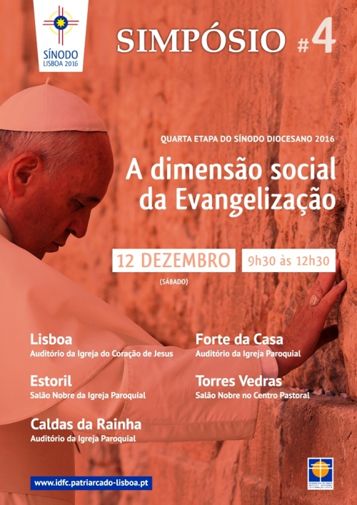 Lisboa (auditório da igreja do Coração de Jesus), Forte da Casa (auditório da igreja paroquial), Estoril (salão nobre da igreja paroquial), Torres Vedras (salão nobre do centro pastoral) e Caldas da Rainha (auditório da igreja paroquial) são os cinco locais da diocese onde vai decorrer, no próximo dia 12 de dezembro, sábado, o Simpósio do Guião #4 do Sínodo Diocesano. Organizada pelo Instituto Diocesano da Formação Cristã (IDFC), do Patriarcado de Lisboa, esta iniciativa decorre em simultâneo nos cinco lugares, entre as 9h30 e as 12h30, e visa analisar a quarta etapa do Sínodo Lisboa’2016, com o tema ‘A dimensão social da Evangelização’.