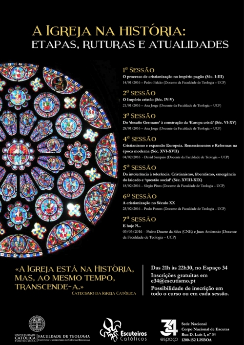 O Corpo Nacional de Escutas, em parceria com a Faculdade de Teologia da Universidade Católica Portuguesa, oferece, a partir de 14 de janeiro de 2016, um curso de história da Igreja, em sete sessões. O curso que tem como tema: ‘A Igreja na história: etapas, ruturas e atualidades’ vai decorrer no Espaço 34 – Sede Nacional do CNE (R. D. Luís I, 35 - Lisboa) e a inscrição para o curso completo ou por sessões, é gratuita e pode ser feita através de e34@escutismo.pt.