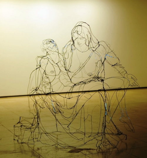 A representação da Pietà é muito anterior à obra do jovem Miguel Ângelo que com apenas 23 anos compôs a conhecida obra de São Pedro. Aqui, ao contrário do pensamento do original autor, o atual autor quis esvaziar de matéria a obra que tinha no pensamento e desenhá-la em escultura. Trata-se, na verdade, de um verdadeiro desenho em matéria que é o arame. A sua fragilidade dá lugar à imponência desta obra. Desenhou verdadeiramente na e para a atualidade uma obra que impressiona. Impõe-se na sua fragilidade. Quis adaptá-la aos lugares desta «Peregrinação» que se pretende com este projeto. Neste caso, e pela sua colocação, quis preenche-la com tule dando-lhe um volume que não está ausente na peça sem preenchimento. O volume vem-lhe pela forma, com preenchimento ou sem ele.