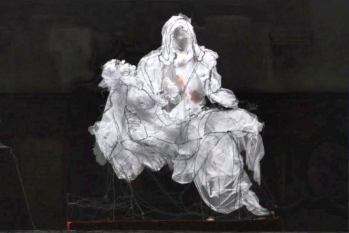 Não pretende ser uma reprodução mas a transformação da matéria e mais ainda da ideia que foi sugerida ao artista a partir dessa belíssima, grandiosa e perfeita escultura do florentino Miguel Ângelo. Trata-se de uma peça toda «tecida» em arame, como, aliás, tem sido prática deste escultor da atualidade. Esta instalação, que se encontra à vista de todos na balaustrada do coro alto da Igreja das Mercês, impõe-se sobre toda a nave da Igreja. Como que um apelo a não olharmos o Natal como um acontecimento qualquer mas a vermo-lo como uma preparação para o acontecimento central da fé: a Páscoa de Jesus. A sua morte e ressurreição já estão presentes em muitas representações da natividade, mas aqui dá-se espaço às palavras do velho Simeão: «Uma espada de dor trespassará a tua alma».