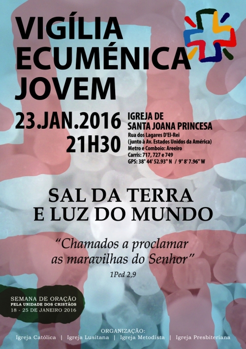 A igreja de Santa Joana Princesa, em Lisboa, acolhe na noite de dia 23 de janeiro, sábado, uma noite de oração pela unidade dos cristãos. A Vigília Ecuménica Jovem, que se insere na Semana de Oração pela Unidade dos Cristãos (18 a 25 de janeiro), tem como tema ‘Sal da Terra, Luz do mundo’ e é organizada conjuntamente pelas Igrejas Católica, Lusitana, Metodista e Presbiteriana.