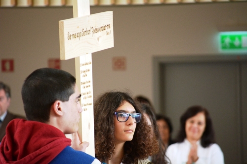 Foi-nos entregue uma t-shirt das Jornadas Vicariais e uma pulseira colorida. De seguida, foi divulgado o hino destas JVJ, que tem por base uma música bem popular que rapidamente nos contagiou. Seguiu-se a apresentação às paróquias da Cruz que representará a Juventude da Vigararia de Oeiras, um pouco à imagem da Cruz das JMJ. Nela está inscrita a mensagem "Eis-me aqui, Senhor! Podeis enviar-me."(Is 6) e assinalados os anos e locais onde as JVJ já se realizaram. Houve ainda um testemunho que nos lembrou que todos contamos e contribuímos para a construção de uma "catedral", seja qual for o nosso talento. Este foi o mote para o tema do dia.