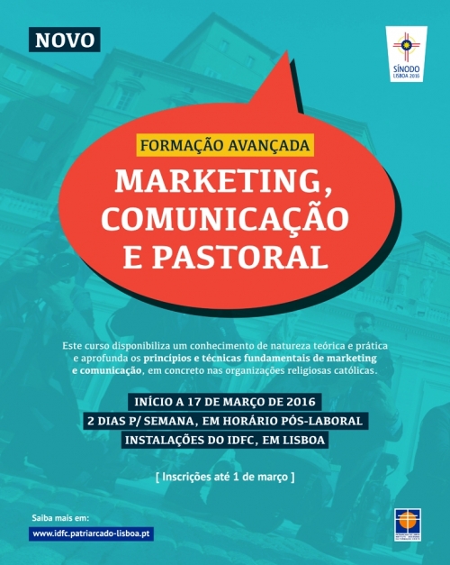 Com início a 17 de março, este curso, segundo a apresentação, “disponibiliza um conhecimento de natureza teórica e prática e aprofunda os princípios e técnicas fundamentais de marketing e comunicação, em concreto nas organizações religiosas católicas”. Em entrevista recente ao Jornal VOZ DA VERDADE, o coordenador científico e executivo desta formação avançada, António Pimenta de Brito, considerava este curso “inovador”, salientando que pretende “trazer autenticidade e proximidade à forma de comunicar na Igreja”.