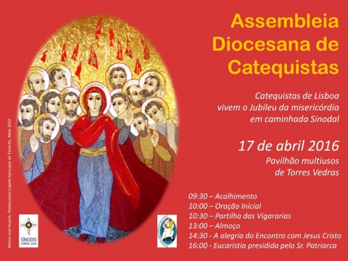 ‘«Catequistas com Espírito»: Acolher o olhar de Jesus, ser dom para todos, educar para a misericórdia’ é o tema da Assembleia Diocesana de Catequistas, que vai ter lugar no pavilhão multiusos de Torres Vedras, no dia 17 de abril, Domingo, entre as 9h30 e as 17h30, e que vai contar com a presença do Cardeal-Patriarca, D. Manuel Clemente. Organizado pelo Departamento da Catequese da diocese, esta iniciativa constitui-se como “um grande encontro dos catequistas do Patriarcado de Lisboa com o seu Bispo, no Ano da Misericórdia e no contexto do Sínodo Diocesano”, refere um comunicado.