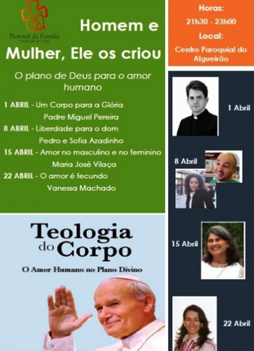 As catequeses que o Papa João Paulo II proferiu sobre a Teologia do Corpo, de 1979 a 1984, vão estar em reflexão, durante o mês de abril, na paróquia de Algueirão - Mem Martins - Mercês. Às sextas-feiras, entre as 21h30 e as 23h00, no centro paroquial do Algueirão, as quatro sessões vão ter como tema ‘Homem e Mulher, Ele os criou - O plano de Deus para o amor humano’. No dia 1, o padre Miguel Pereira fala sobre ‘Um Corpo para a Glória’, no dia 8, Pedro e Sofia Azadinho refletem acerca da ‘Liberdade para o dom’ e, a 15 de abril, Maria José Vilaça sobre ‘Amor no masculino e no feminino’. Este ciclo termina dia 22, com Vanessa Machado a refletir sobre ‘O amor é fecundo’.