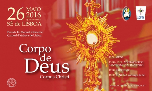 A Solenidade do Santíssimo Corpo e Sangue de Cristo, popularmente conhecida como Corpo de Deus, volta este ano a ser celebrada à quinta-feira, mais propriamente no dia 26 de maio. Na Sé Patriarcal de Lisboa, às 11h30, a celebração da Eucaristia nesta solenidade vai ser presidida pelo Cardeal-Patriarca de Lisboa, D. Manuel Clemente. Após a celebração, haverá, entre as 13h00 e as 16h00, Adoração do Santíssimo Sacramento.