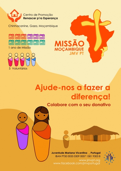 ‘Missão Ad’gentes em Moçambique’ é um projeto de amor, segundo a organização. “Um novo apelo e desafio missionário surge agora em Chirrundzo, onde várias crianças necessitam da mão amiga e solidária dos jovens JMV. Deste apelo nasce o projeto “Renascer P’ra Esperança”, para onde cinco jovens voluntários deverão partir em setembro de 2016, para ações de voluntariado de curta e longa duração, com a permanência de 3 a 12 meses. Este é um projeto de esperança, de alegria, de misericórdia... é um projeto de amor que põe em evidência o carisma vicentino que sentimos nas entranhas”, frisa um comunicado.